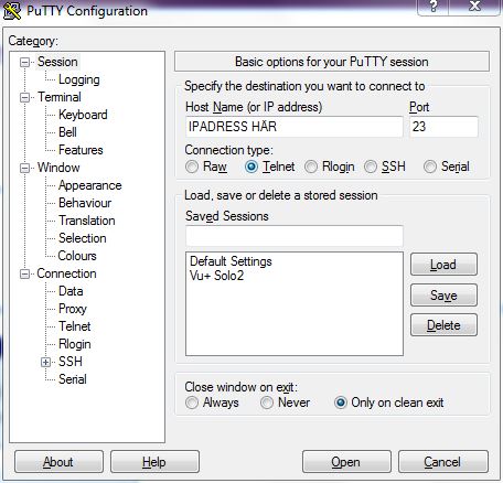 Starta PuTTY, fyll i boxens IP, välj Telnet och sedan på "Open".